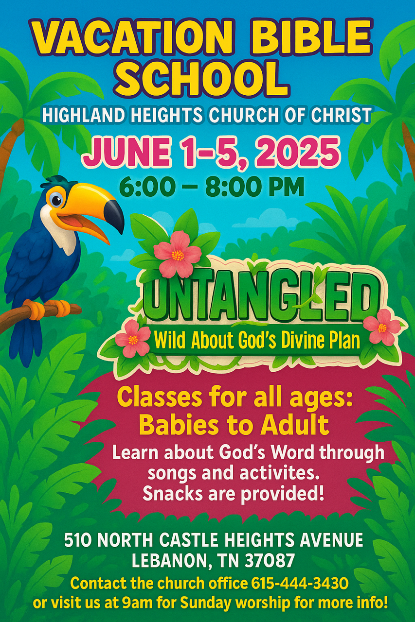 510 North Castle Heights Avenue Lebanon, TN 37087 Directions Highland Heights Church of Christ June 1 – 5, 2025 6:00 pm – 8:00 pm 2025 Vacation Bible School Share this: Share on X (Opens in new window) X Share on Facebook (Opens in new window) Facebook Share on Pinterest (Opens in new window) Pinterest Email a link to a friend (Opens in new window) Email Like this:Like Loading... Related