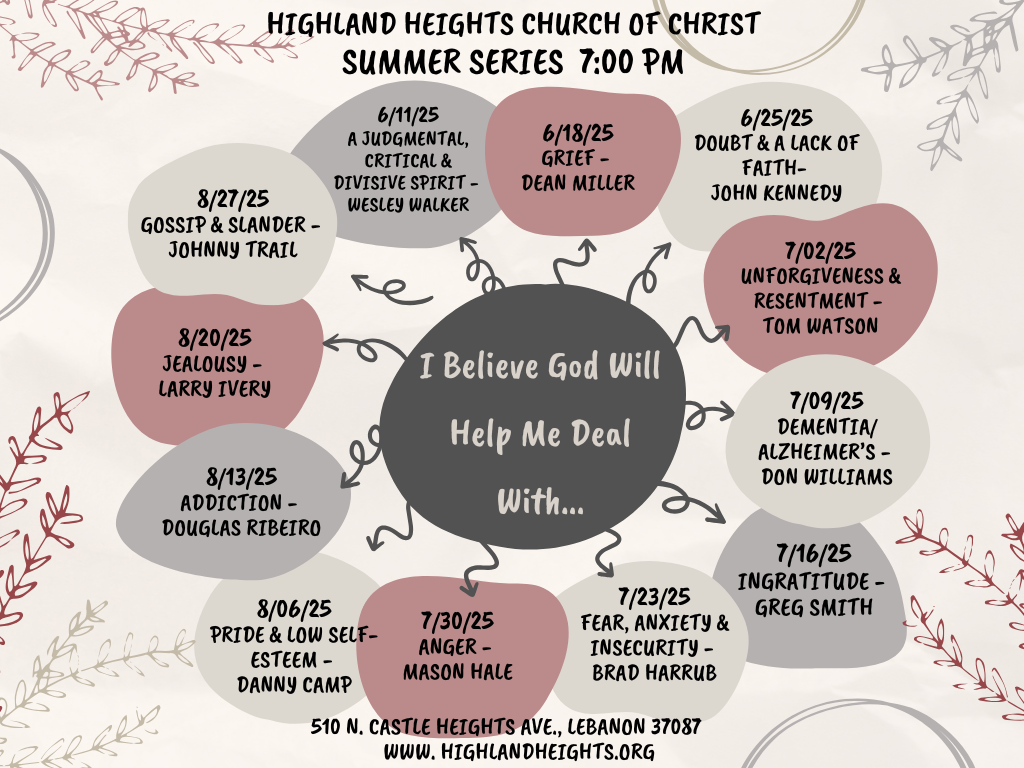 510 North Castle Heights Avenue Lebanon, TN 37087 Directions Highland Heights Church of Christ August 27, 2025 Summer Series: I Believe God Will Help Me Deal With . . . Share this: Share on X (Opens in new window) X Share on Facebook (Opens in new window) Facebook Share on Pinterest (Opens in new window) Pinterest Email a link to a friend (Opens in new window) Email Like this:Like Loading... Related