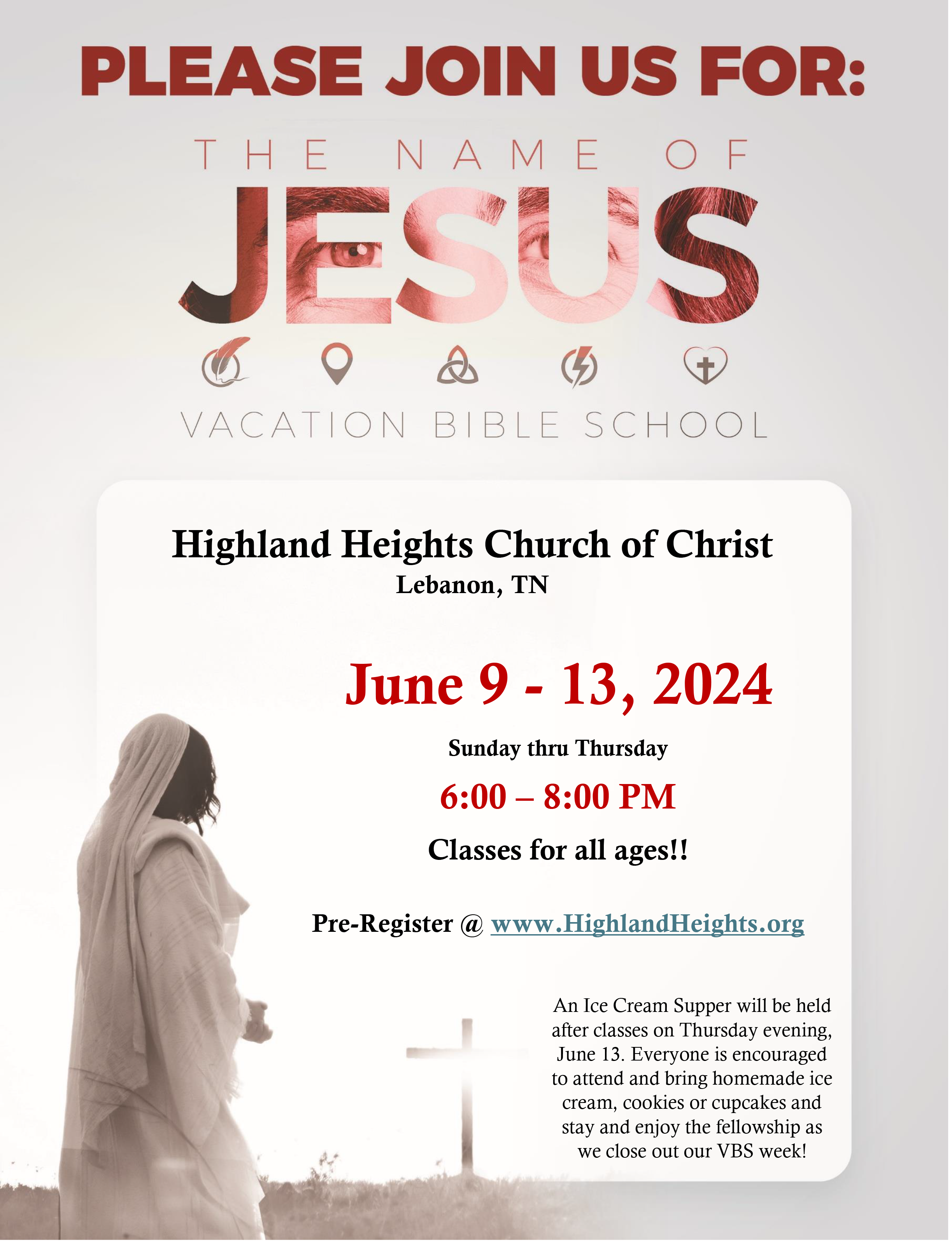510 North Castle Heights Avenue Lebanon, TN 37087 Directions Register Highland Heights Church of Christ June 9 – 13, 2024 6:00 pm – 8:00 pm Vacation Bible School: The Name of Jesus Click/tap here to register Share this: Share on X (Opens in new window) X Share on Facebook (Opens in new window) Facebook Share on Pinterest (Opens in new window) Pinterest Email a link to a friend (Opens in new window) Email Like this:Like Loading... Related